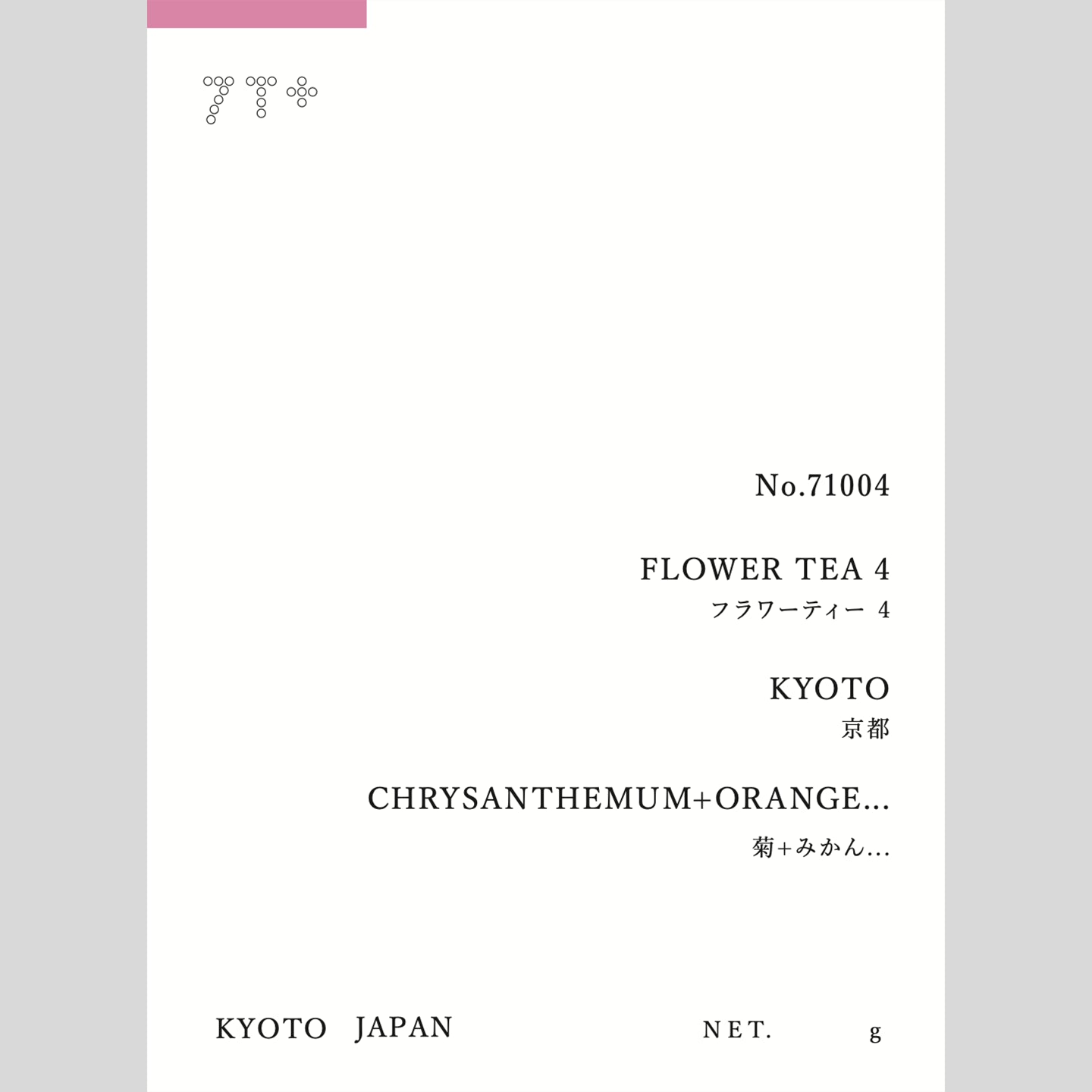 ノンカフェインフラワーティー No.4は、菊を主役に、みかんのやさしい甘酸っぱさと、和のハーブとも言える黒文字の凛とした清涼感を重ねたブレンド。ひとつまみのネトルリーフが渋みや重さを出さずに全体を静かに整えてくれています。湯を注ぐと、菊のキリッとした香りの奥から柑橘の風味がふわっと立ち上がり、口当たりはさらり。飲み進めるほどに黒文字の木肌のような香りが現れ、余韻は透明にほどけていきます。菊の微かなほろ苦さが甘さを引き締め、後口に心地よい静けさ。季節の変わり目や、気分を整えたい午後に。和菓子や白あん、柑橘のデザートとも相性の良い、私たちのフラワーティーで最も“日本”を感じる個性。アイスでも香りが崩れず、食中にもおすすめです。
