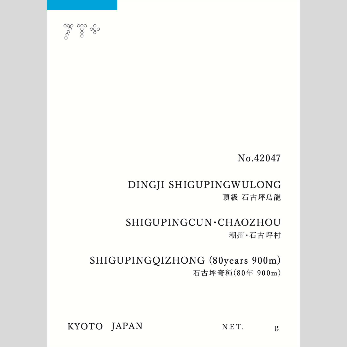 石古坪烏龍茶は広東省潮州・潮安地区、石古坪村に伝わる固有の在来品種から作られています。畬(シェ)族が「鳥嘴茶」と呼ぶ、独自の遺伝系統をもつ茶樹。栽培の歴史は400年以上ともいわれ、烏龍の製法もこの畬族が最初に編み出したという伝承が残ります。こちらは特に出来の良かった特別なもの。乾燥茶葉からも石古坪烏龍らしい独特のオーラが溢れています。湯色は「緑豆水」と評される透明感ある黄緑色。新鮮でまろやか、すっと軽やかな口当たりで渋みは穏やか。奥行きある回甘が長く続きます。飲む日によって異なる表情を見せてくれる万華鏡のようなお茶ですが、乾燥パイナップルやココナッツミルクっぽさを仄かに感じる時には嬉しくなります。店主・中野のお気に入りです。