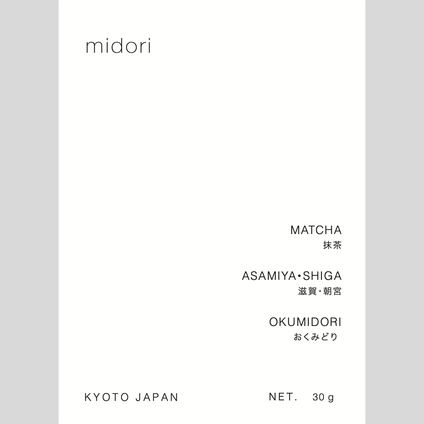 深みのある緑色。滋賀・朝宮(信楽)の山里、標高400m前後の傾斜地で、霧と冷涼な気候、昼夜の寒暖差の中ゆっくり育った碾茶を、オクミドリ単一品種で挽いた抹茶です。一般的な宇治抹茶の絶妙なブレンドで整えた優等生感はありませんが、代わりに単一品種ならではの品種の表情がそのまま立ち上がる感じがあるのが魅力。オクミドリは旨みが丸く渋みが出にくい晩生系。柔らかい口当たりにふくよかなコクが重なり、若葉とほのかな木肌の香りの奥に青い清涼感がすっと伸びます。花崗岩を基盤に、古琵琶湖層群の堆積物が重なる信楽・朝宮の土壌の影響か、微かなミネラル感が後口を整え、味わいは舌に重く残らず静かにほどけるよう。透明感が長く続く綺麗な余韻の山の抹茶。